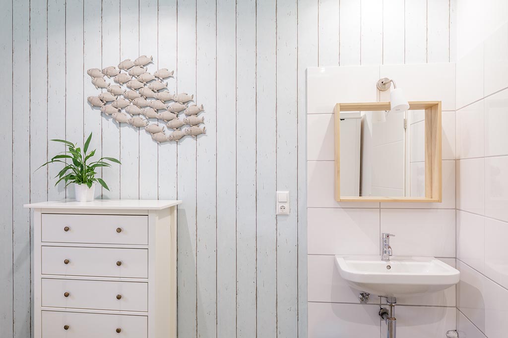Maritimes Ferienhaus mit sonniger Terrasse.